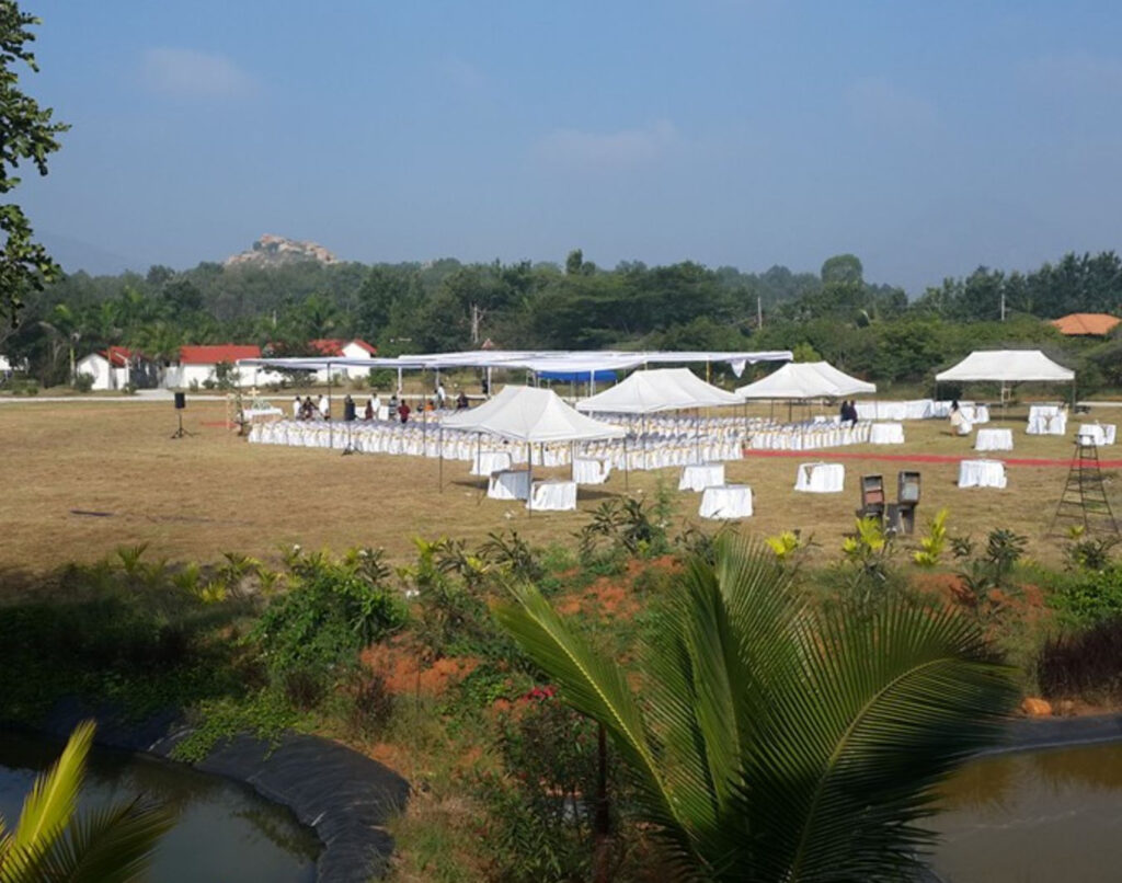We offer spacious halls, open grounds, cozy accommodations, dining facilities, a campfire area, and serene spots for prayer and reflection.